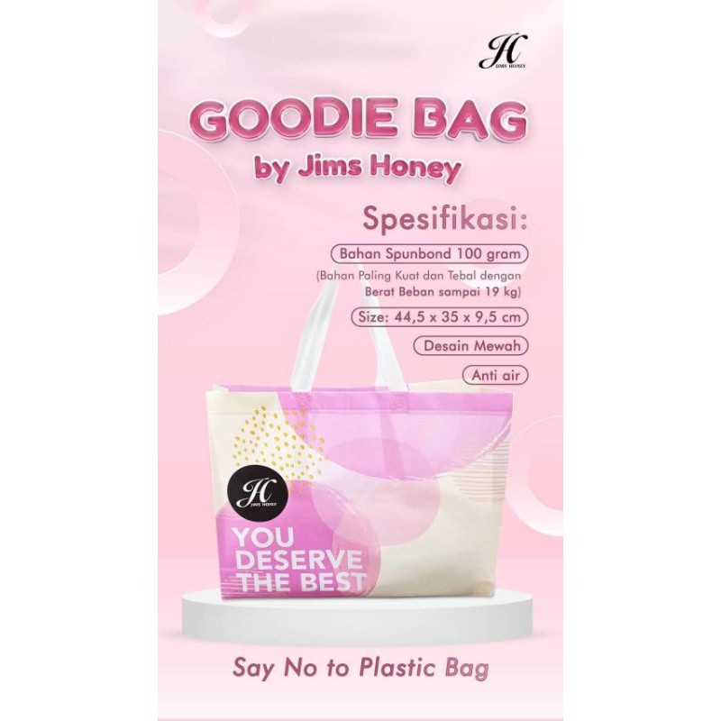 Introducing #JHGoodieBag from Jims Honey.Say No to Plastic Bag #JHLADIES! Yuk bantu jaga bumi kita dengan menggunakan tas belanja ramah lingkungan. #JHGoodieBag menjadi alternatif pengganti plastik belanjaan kamu loh. Menggunakan ini kamu turut menjaga bumi dari krisis iklim dan bencana ekosistem..Dengan desain mewah menggunakan bahan spunbond 100 gram, dimana merupakan bahan spunbond paling kuat dan tebal. Bisa menampung isi sampai dengan 19 kg / setara 1 galon air. Bisa digunakan berulang - ulang dan anti air. Pembuatan Goodie Bag menggunakan teknik jahitan yg rapi dan sangat kuat. Memiliki ukuran 44,5 x 35x 9,5 cm..So, miliki sesegera mungkin karena Goodie Bag ini sangat-sangat limit loh dan jangan sampai kehabisan.Mari Jaga Bumi Kita #JHLadies!.Price: IDR 9.900.#iCarryJH #JHGoodieBag #GoodieBag #JimsHoney #newnormal #tasbelanja #produkramahlingk