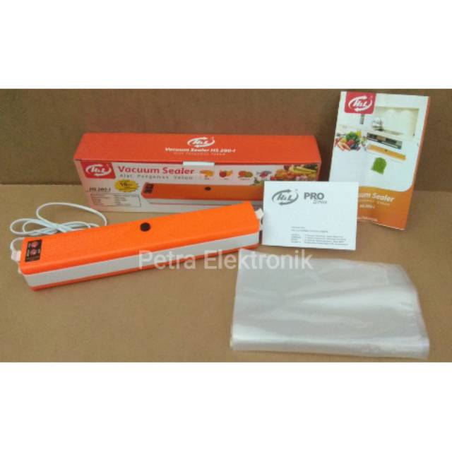 Deskripsi :*Size Product 380x65x55 mm*Vacuum Pressure : 500mmHg*Voltage : 220V/50Hz*Motor Capacity : 70 Watt*Seal Size : 280mm x 2 mmIsi Dus & Kelengkapan :*1 Unit Vacuum Sealer HS-280*Manual Book / Buku Petunjuk Penggunaan.*Free 10 Lembar Plastic Emboss : 15x20cm = 5 lembar, 20x25cm = 5 lembarKegunaan :*Mesin ini berfungsi untuk membungkus ataupun menyegel makanan Anda agar tetap fresh, awet, dan segar. seperti daging, ikan, sayuran, kacang-kacangan dll. Anda juga dapat menggunakan sealer elektrik ini untuk melakukan pengemasan bagi produk makanan yang akan Anda jual.*Cara kerja mesin ini adalah mengosongkan udara dikemasan plastic agar makanan lebih tahan lama. Sangat cocok untuk anda yang sering jalan jalan, dan membuka usaha dibidang kuli
