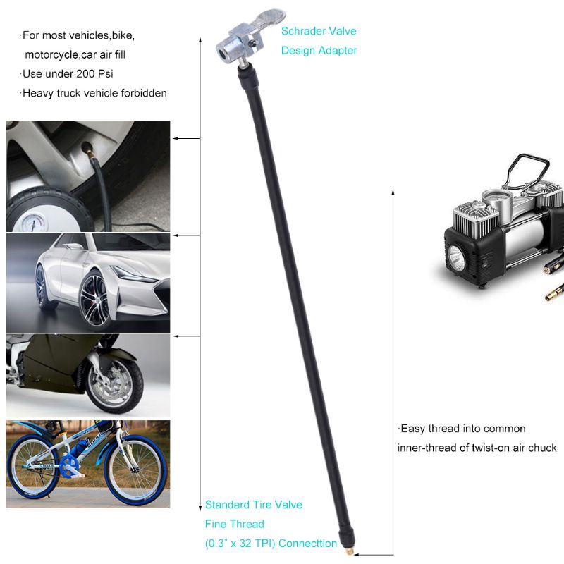 Locking Air Chuck with Air Hose and Standard Tire Valve Fine Thread Air Inflator Hose Adapter Twist Lock On Connection for bike, motorcycle, car tireFeaturesPremium Tire Inflator Hose Adapter, designed for tire inflator hose converting, easily convert tire inflator's twist-on connection to lock-on connection. Screw adapter end onto original inflator hose, press to clamp adapter head onto tire valve, start the inflator for a quickly and none leaking inflation.All metal construction air chuck, portable tire inflator chuck adapter, for bike, motorcycle, car air fill. Open flow 90 degree thumb-press air chuck, easy and quick hands-free inflation.Excellent tight seal lock-on air chuck, make sure no annoying air leaking. High quality rubber hose, durable and flexible.Standard us fine thread connection (5/16”x32TPI), the same as the thread on all USA standard car valve stems, compatible with inner thread of twist-on air chuck. Convert tire inflator twist-on air chuck to lock-on air chuck.All metal construction, portable tire inflator chuck adapter, designed with standard US fine thread for twist-on air chuck convert to lock-on connection, ideal for bike, motorcycle, car tire air fill. Specifications:Connection thread: 0.305"x32TPI (5/16"x32TPI)Hose length: 10cm/20cm/60cm (3.93in/7.87in/23.6in)Connection type: Thumb press lock onAir chuck type: Schrader valveMaterial: all metal air chuck+rubber hose+brass connection fittingNote:Item color displayed in photos may be showing slightly different on your computer monitor since monitors are not calibrated same.Please allow 1-3mm slight deviation due to manual measurement. Thank you! Package include:1 x Locking Air Chuck with Air Hose and Standard Tire Valve Fine T