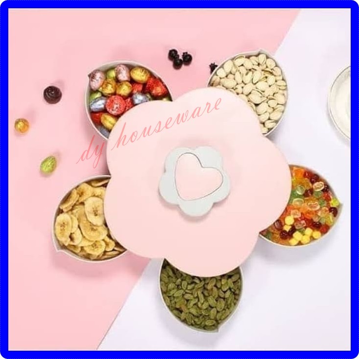 Selamat datang ..Semua produk di etalase kami adalahReady stock dan siap dikirimterima kasih ..Deskripsi Toples Bunga Putar Wadah Kue Candy Box- Terdapat 5 tempat penyimpanan kue kering Lebih Hemat, daripada Anda harus membeli 5 toples sekaligus biaya yang keluar lebih banyak.- 1 Toples bisa untuk 5 wadah makanan, yang sudah pasti hemat dan efisien.- Warna yang begitu cantik & elegan- Bisa buka tutup dan mudah dalam membukanya- Bisa untuk menempatkan HP di atas toples- Bisa juga untuk toples Bumbu- Kotak Buah Kecil dengan Kelopak Style yang Creative- Terdapat Putaran Buka dan Tutup- Bahan yg AmanUkuran Toples besar saat ditutup 27cm × 27cm × 8cmSaat di buka 5 wadahnya menjadi 43cm × 43cm